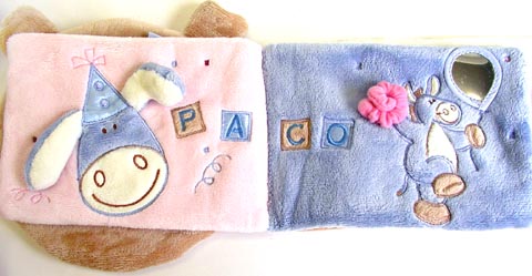 ロバのパコのお耳は動かして遊べます。 右のページのパコは、ソフトミラーの風船と、ゴムの通っピンクのボンボンを持っています。ボンボンは、ビョーンと引っ張って遊べますよ。