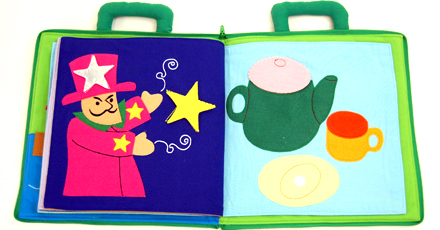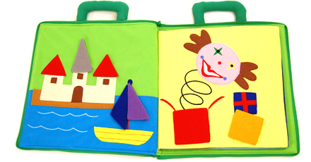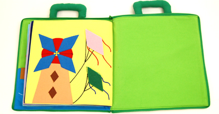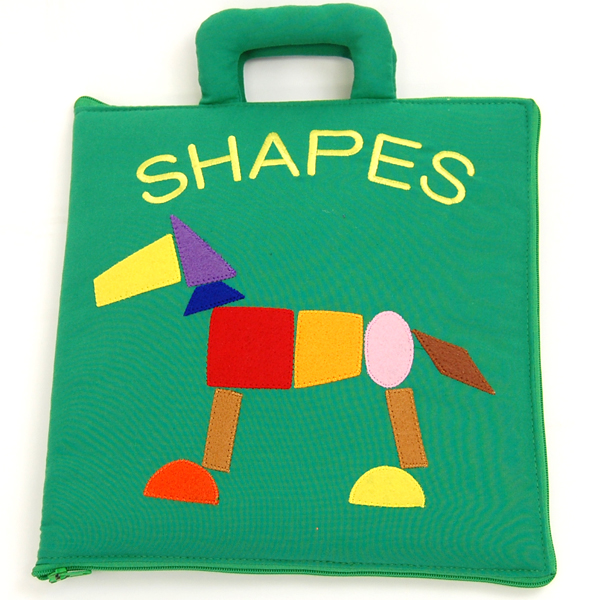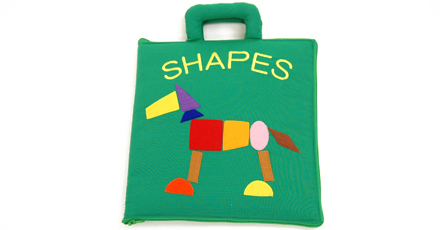 パズル感覚で形のピースを貼りつけていくうちに、身の回りのものが形からできていることや、形のおもしろさに気づいたり、形への興味を広げ、楽しく遊んでいるうちに自然に図形の基本が身につくという布絵本。